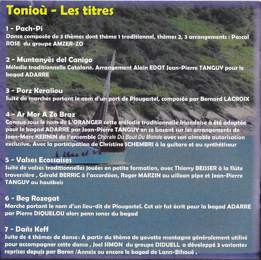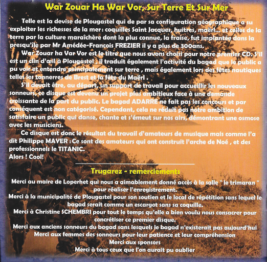 Info aux heureux lecteurs de ce site. Merci d'apporter vos commentaires et améliorations éventuelles souhaitées sur Cette adresse e-mail est protégée contre les robots spammeurs. Vous devez activer le JavaScript pour la visualiser. . Le site évolue et évoluera grace à l'ensemble du bagad.